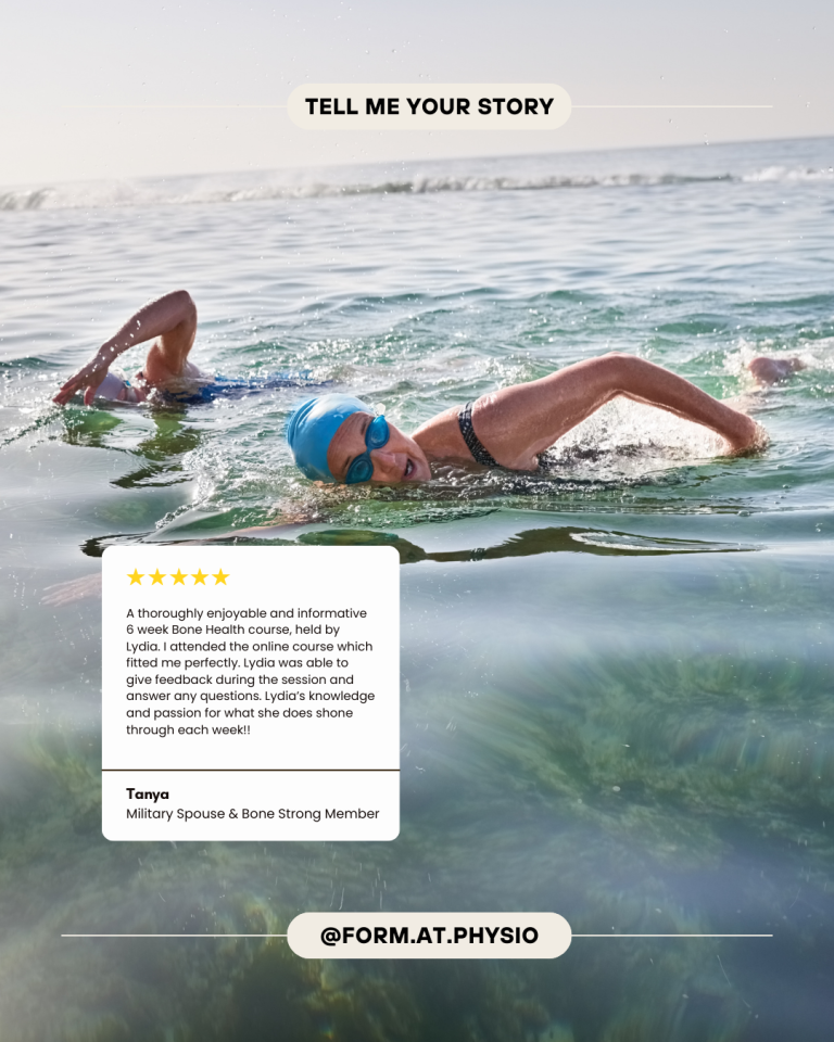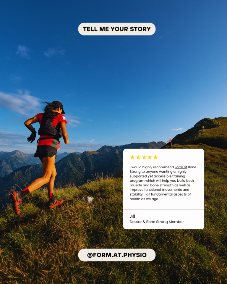 Form.at.Bone Strong is a 6-week online, on-demand course integrating evidence-based bone health education with progressive strength, stability, and reactivity training to support lifelong movement – without the guesswork.